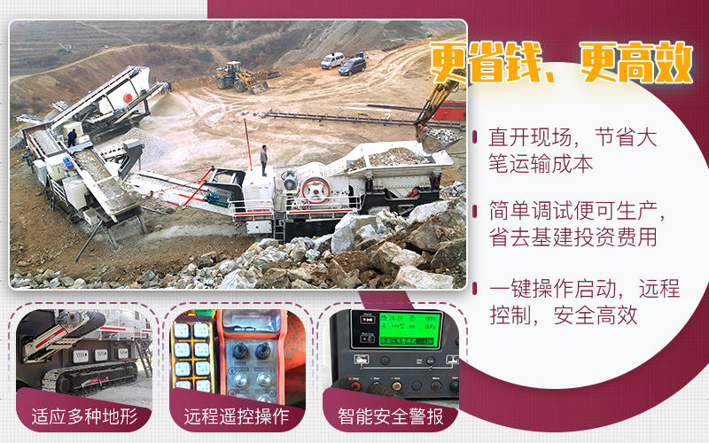 大型磕石制砂一體機是通過輪胎式或履帶式車架與鄂破、反擊破、錘破、圓錐破、制砂機、振動篩靈活配置,整體搭配緊湊,油電兩用,配有PLC智能電控箱,可遠程控制,根據客戶的實際生產狀況不同,配置方案多種多樣,比如以下客戶的方案。